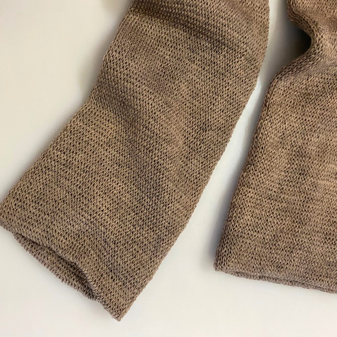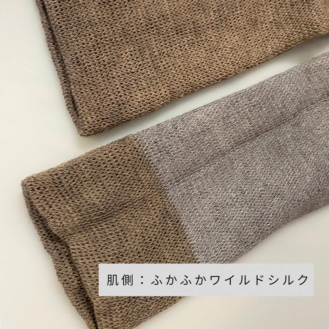 内側はふかふかのワイルドシルク、外側はやさしいウール。 一見きゅっと見えて、着けると驚くほど心地よいフィット感。 冷えやすいふくらはぎを、やさしく温め、めぐりを支えます。