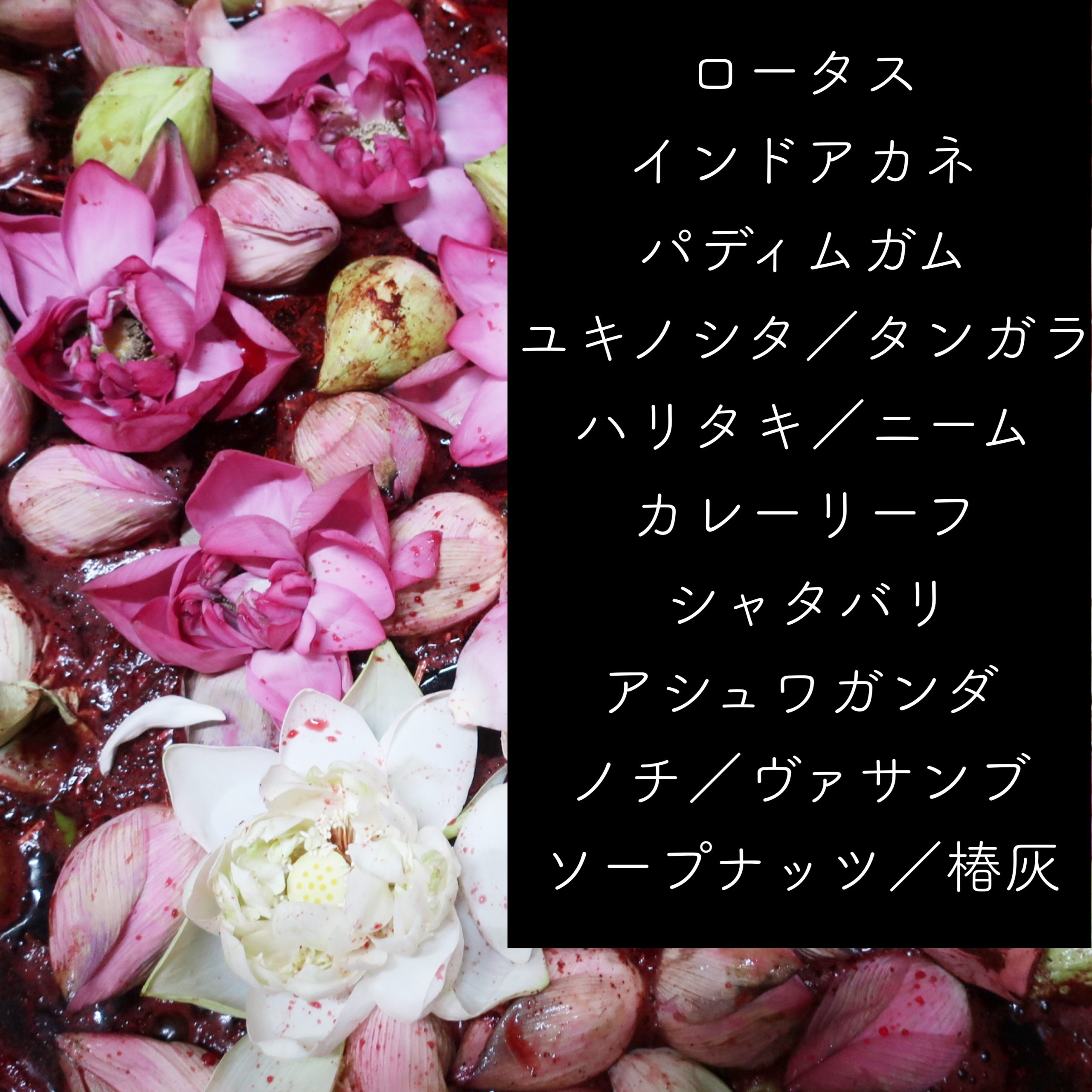 約15種の薬草ハーブで染め上げた、やわらかなロータスカラー。シャタバリやアシュワガンダなど、女性にやさしい薬草をたっぷり含ませています。