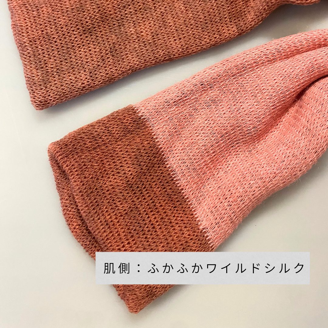 内側はふかふかのワイルドシルク、外側はやさしいウール。 一見きゅっと見えて、着けると驚くほど心地よいフィット感。 冷えやすいふくらはぎを、やさしく温め、めぐりを支えます。
